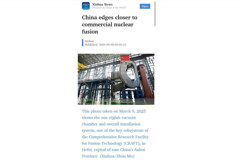 4月8日,《新华社》海外APP以《China edges closer to commercial nuclear fusion》为题,报道了中国商业核聚变的发展情况,并提及瀚海聚能等中国企业在商业核聚变上的探索及取得的成绩。该文章还获得了国务院新闻办公室英文网站转发,获得了高度关注。