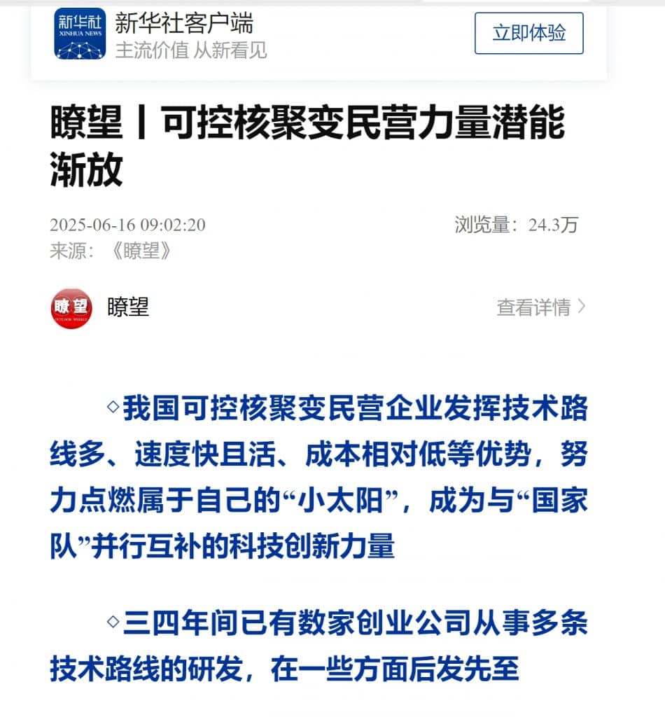 6月16日,《瞭望》新闻周刊2025年第24期《深观察》栏目以《可控核聚变民营力量潜能渐放》为题,聚焦瀚海聚能(成都)科技有限公司等民营力量推动我国核聚变行业发展。这也是央级媒体今年第三次聚焦瀚海聚能、民营聚变公司,彰显了媒体、公众对可控核聚变行业发展的关注,及对瀚海聚能等民营力量推动核聚变行业发展的肯定。该文章同步发布到新华社客户端,浏览量快速突破20万。