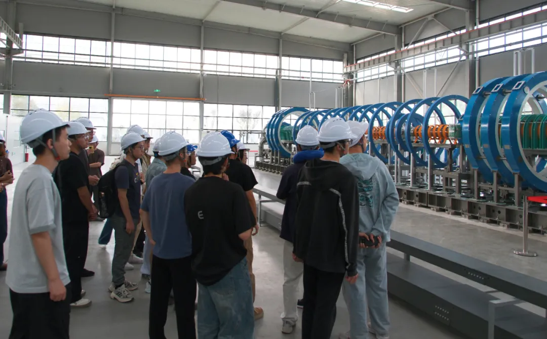 最令人期待的环节当属装置参观。在工作人员的引导下,同学们前往了装置研发区域,近距离接触瀚海聚能一代直线型场反位形(FRC)聚变装置—HHMAX-901。当照片、电视上的“核聚变装置”以实体形态映入眼帘时,现场响起阵阵惊叹。同学们围绕装置,近距离观察、提问,与工程师进行深入交流,亲身感受科技发展带来的震撼。