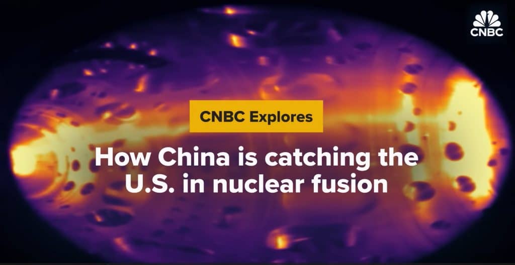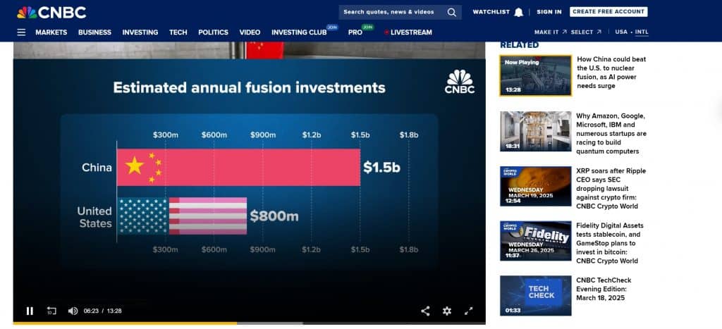 3月中旬,CNBC(美国消费者新闻与商业频道)推出一期时长13分钟的专题片,在介绍核聚变的同时,全面聚焦中美两国在核聚变领域的竞争,并表示,中国和美国正在竞相创造第一个电网规模的核聚变能源。专题片呈现出了美国核聚变行业上下对中国核聚变产业崛起及即将超过美国的担忧,呼吁美国政府采取行动,加大在核聚变领域上的投入与支持,帮助美国企业赢得竞争。