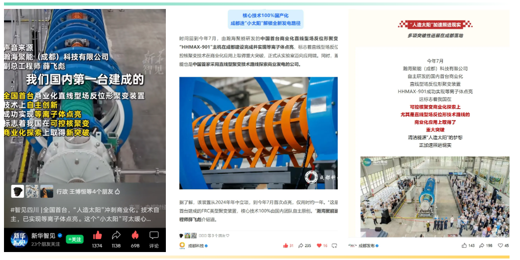 近期,瀚海聚能发展得到各级媒体高度关注。2025年12月9日,新华社科技视频号“新华智见”以《全球首台,“人造太阳”冲刺商业化》为题发布短视频,聚焦瀚海聚能全国首台商业化直线型场反位形聚变装置的技术创新、建设进展。12月16日,成都市科技局官方微信公众号《成都科技》以《全国首台!成都造“小太阳”预计2028年实现首次核聚变发电|科技一线》为题推出图文+视频的专题报道,聚焦瀚海聚能的科技创新和装置建设、运行情况。12月30日,《成都发布》推出《成都造,够!硬!核!》专题,盘点了成都市2025年的明星产品、重大技术突破,专门在“‘人造太阳’加速照进现实”篇章中列举了瀚海聚能HHMAX-901成功实现等离子体点亮,标志我国在可控核聚变商业化探索上,尤其是直线型场反位形技术路线的商业化应用上取得了重大突破。