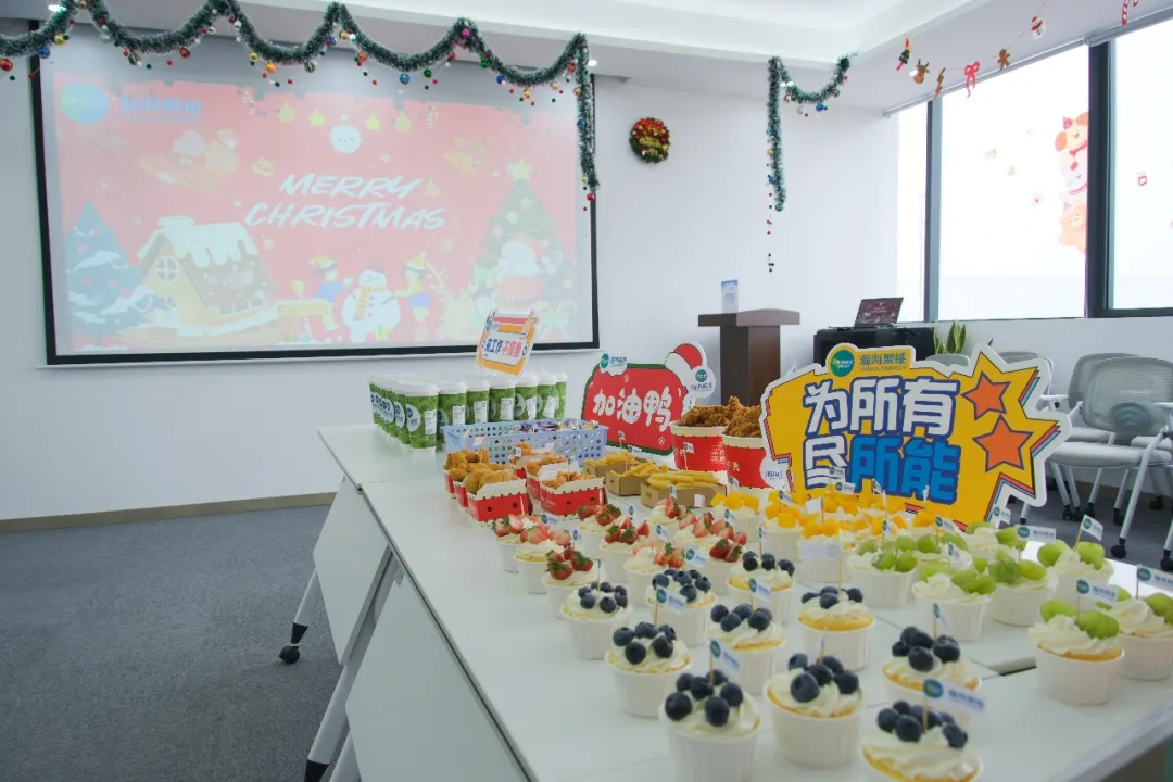 平日讨论工作的会议室被精心装点,主题背景板流光溢彩,映照着每一张抵达的笑脸。精巧的甜点、可口的炸鸡、冒着着热气的饮品交织出香甜气息,让今天格外温馨。