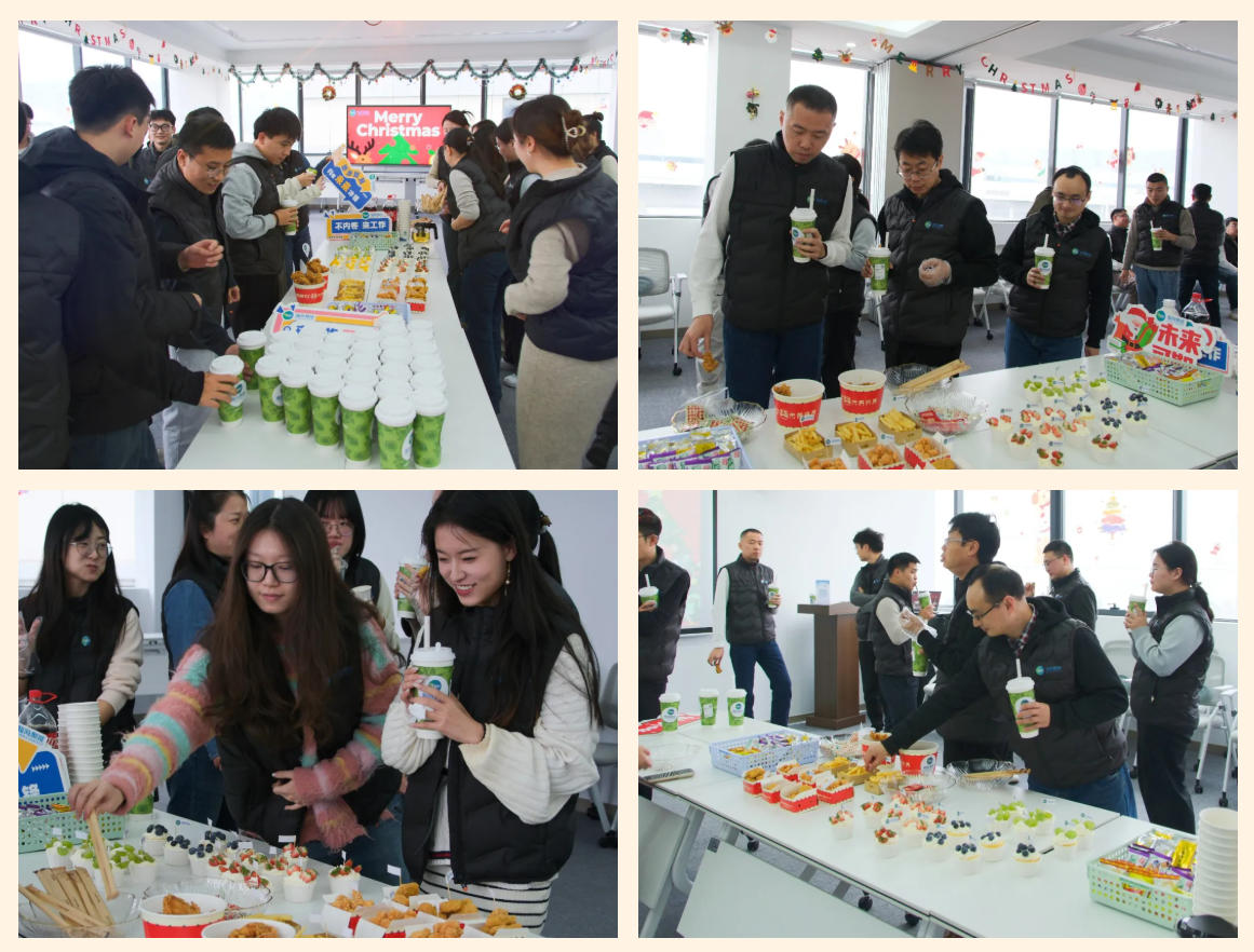 活动中,大家暂时放下手中工作,环绕着铺满美食的长桌自在流连。空气里弥漫着奶茶的醇香、甜点的烘焙暖意,与炸鸡的诱人气息交织在一起。没有固定的座位,也没有议程的追赶,同事们手持餐盘,自然而然地聚拢、交谈,分享生活和工作中的趣事。