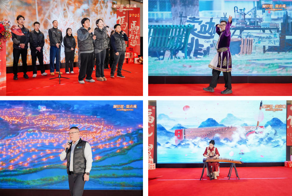 同心绽放,共赴欢乐盛宴 梦想需要激情灌溉,未来亦需快乐相伴。表彰典礼后,新春欢庆盛宴正式开启。由公司员工带来的合唱《最初的梦想》拉开文艺演出序幕,热情歌声唱出初心不忘;特邀嘉宾演绎的古筝《战台风》气势磅礴、舞蹈《融情成都》热情洋溢、《彝族敬酒歌》则将晚宴气氛推向最高点。